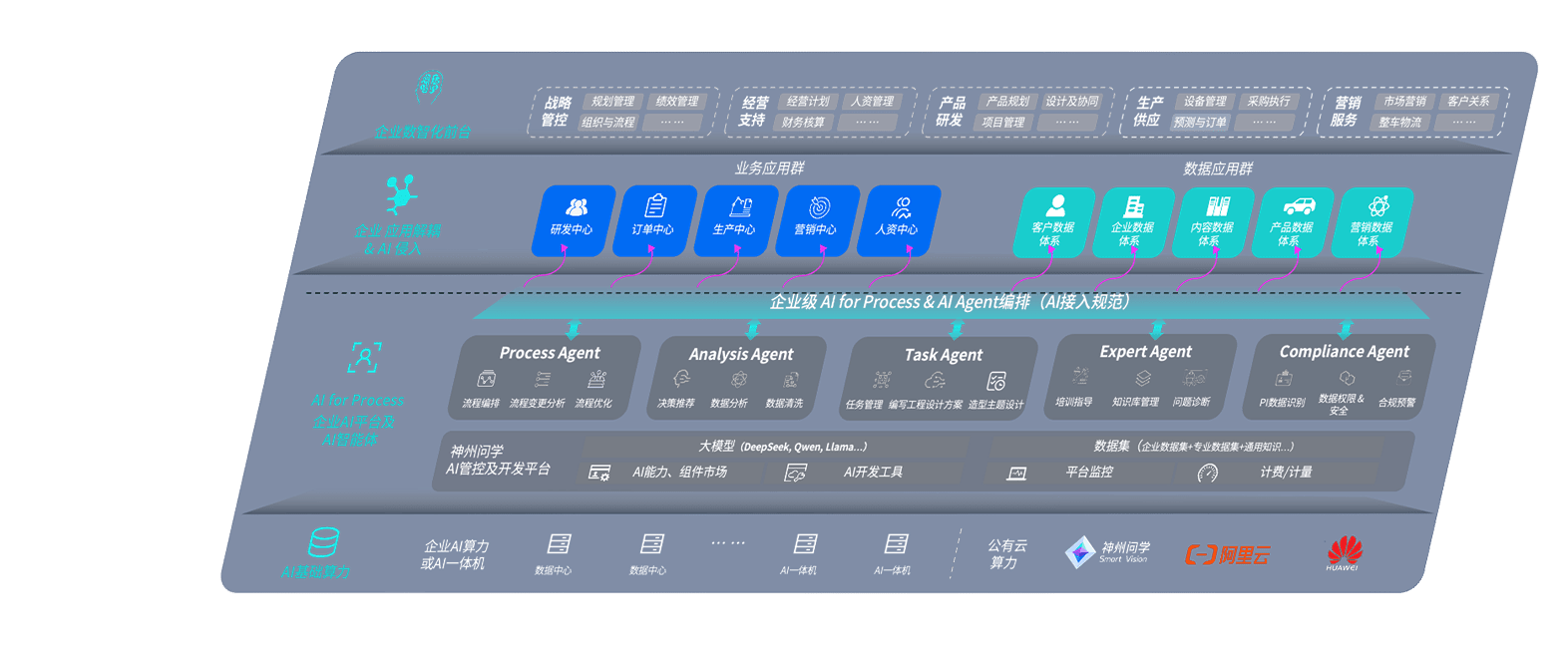 端到端的一站式AI工作空间深度融合了从企业战略规划到日常经营的全流程业务板块,,,定向解决车企内部领域多、、、、部门多、、、链条长、、场景碎片化等难题,,,,支持车企快速构建以AI为核心的生产力写作体系,,,,实现任务执行与AI能力的无缝集成与交互