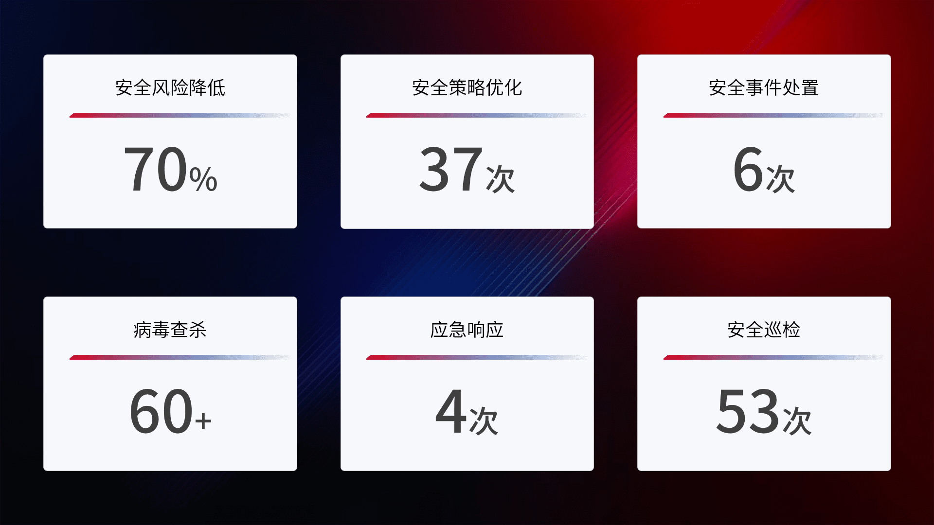提供全面的安全事件报告体系,,,,包括处置报告、、周报、、、季度和年度总结,,,结合持续监控,,帮助客户深入了解网络安全状况。。。。