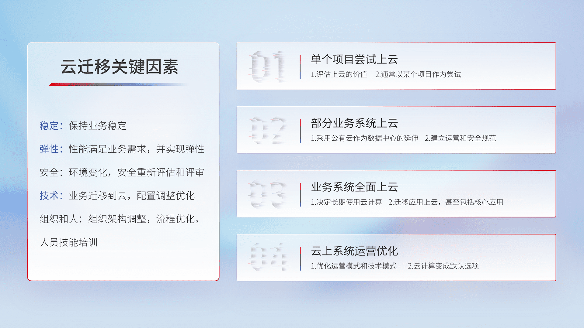 结合实际业务,,从规划设计、、、、云平台选型、、、云原生改造、、、、数据迁移、、集成交付,,迁移全过程为客户识别最佳上云路径,,,,做好风险识别管理,,,设计网络架构、、身份权限、、安全审计合规、、操作审计、、、日志审计、、监控告警策略、、、、多站点容灾设计等,,,,对云上基础设施进行整体规划,,,提升IT治理水平,,以满足弹性、、、高可用、、、高性能的需求。。。。