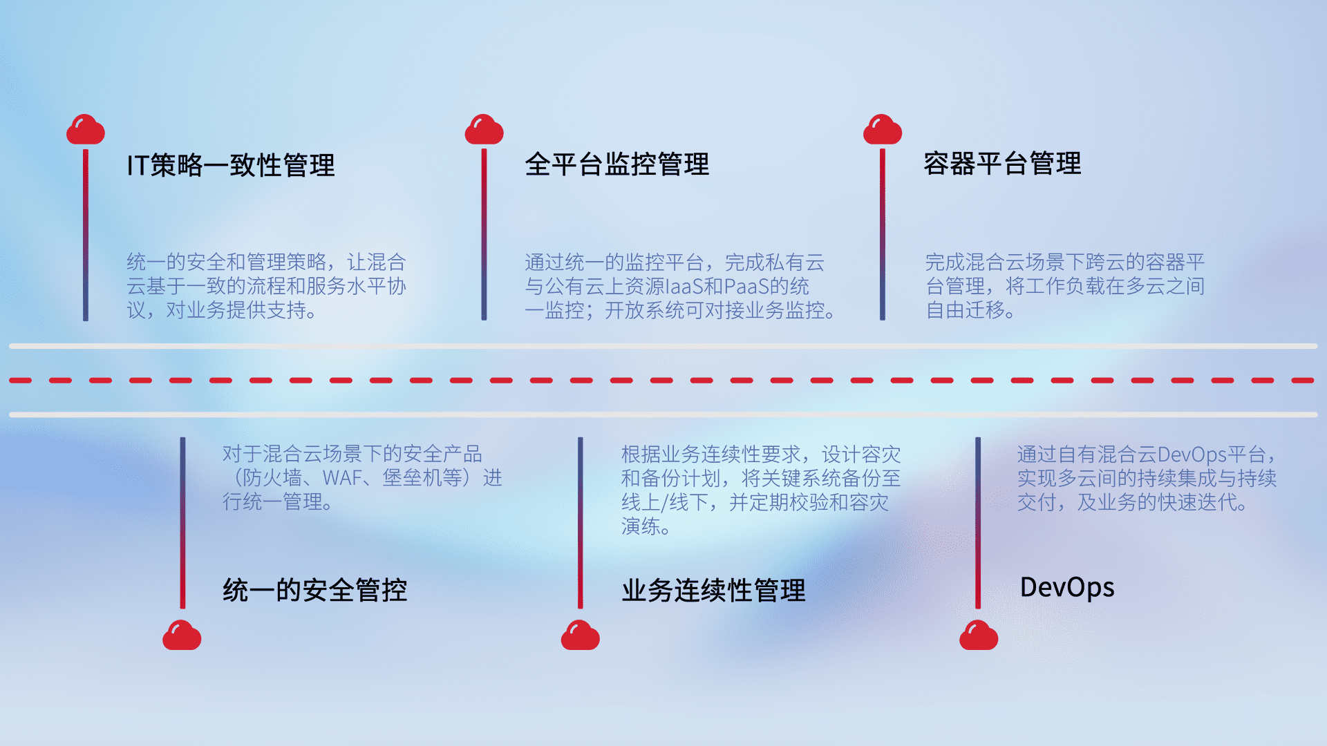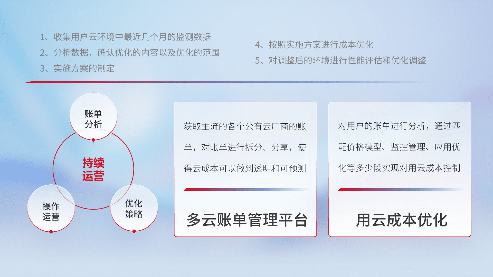 通过多云纳管,,,,以统一的资源数据模型把客户的云资源进行抽象和封装,,进而实现对多云资源的统一操作,,,,保障云资源管理的可靠性、、稳定性与可用性。。量身定制化运维内容,,,,配置、、开发运维、、补丁管理、、备份、、监控、、、、认证和访问管理、、、审计和日常巡检等,,,,保障在用云过程中的可靠度,,,,稳定度以及高可用率。。。